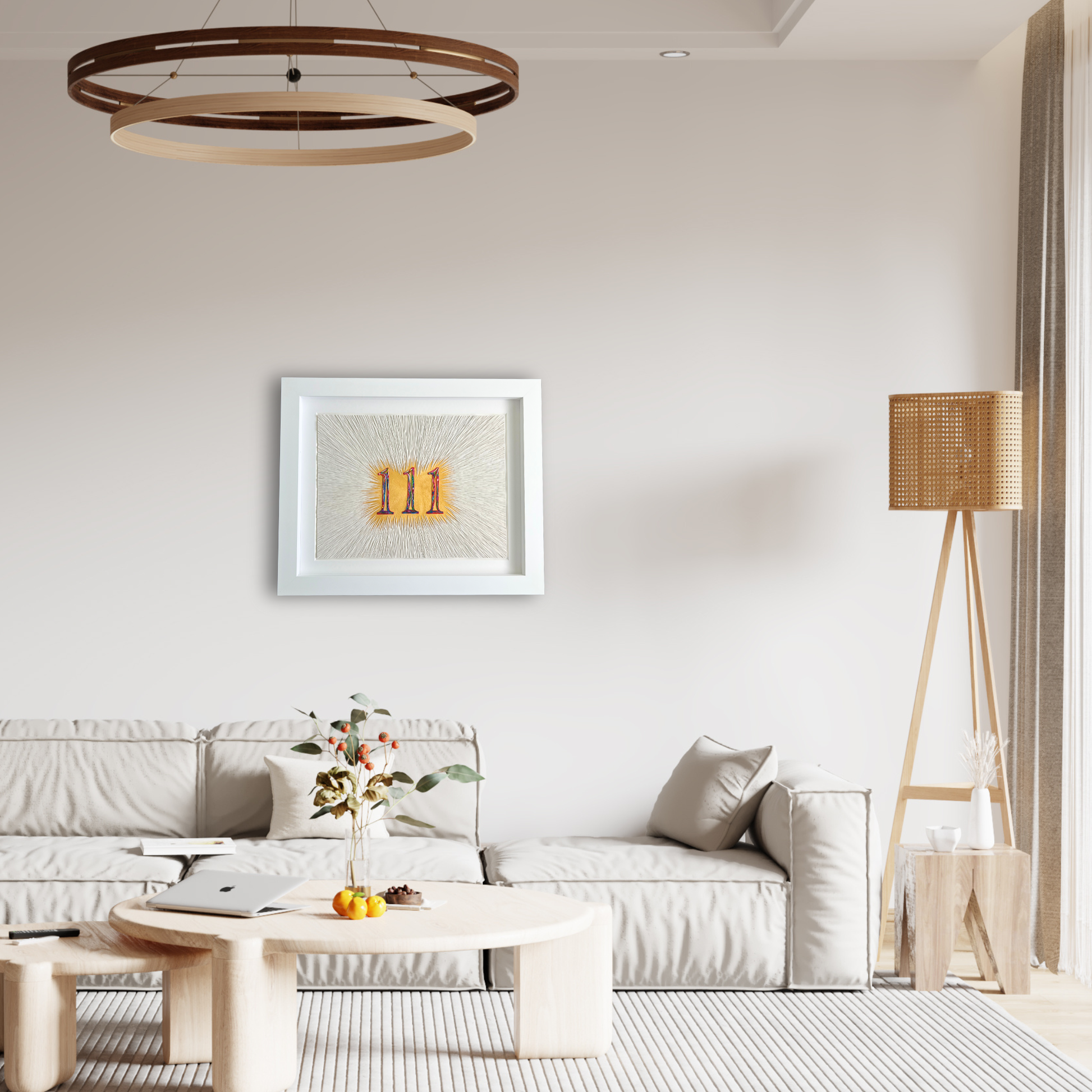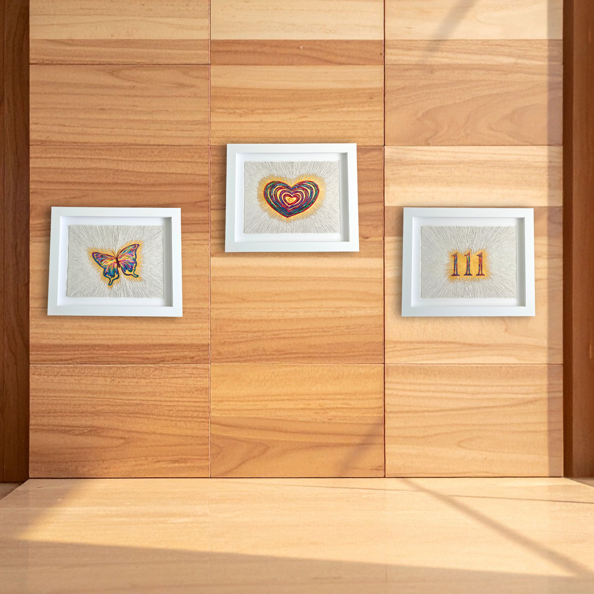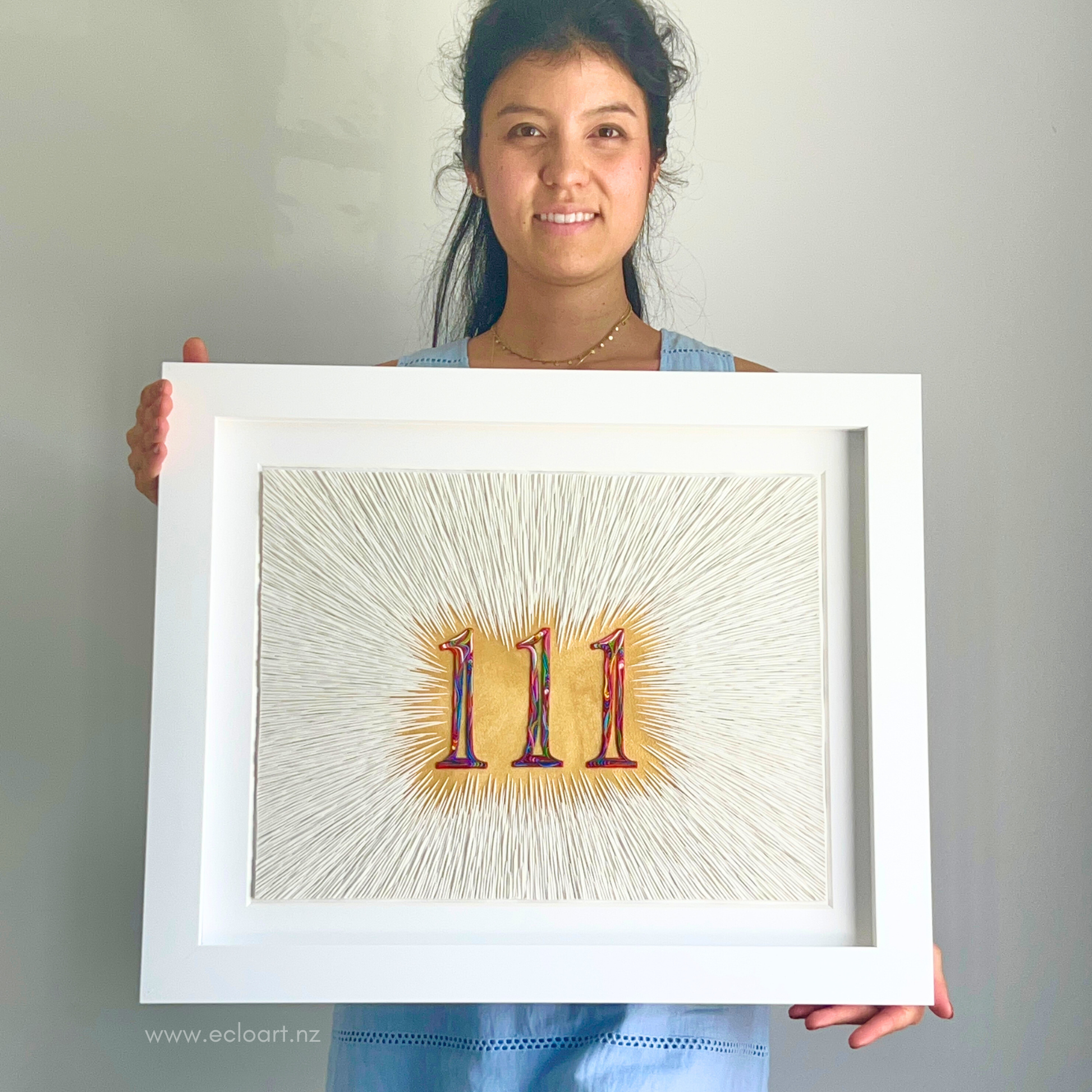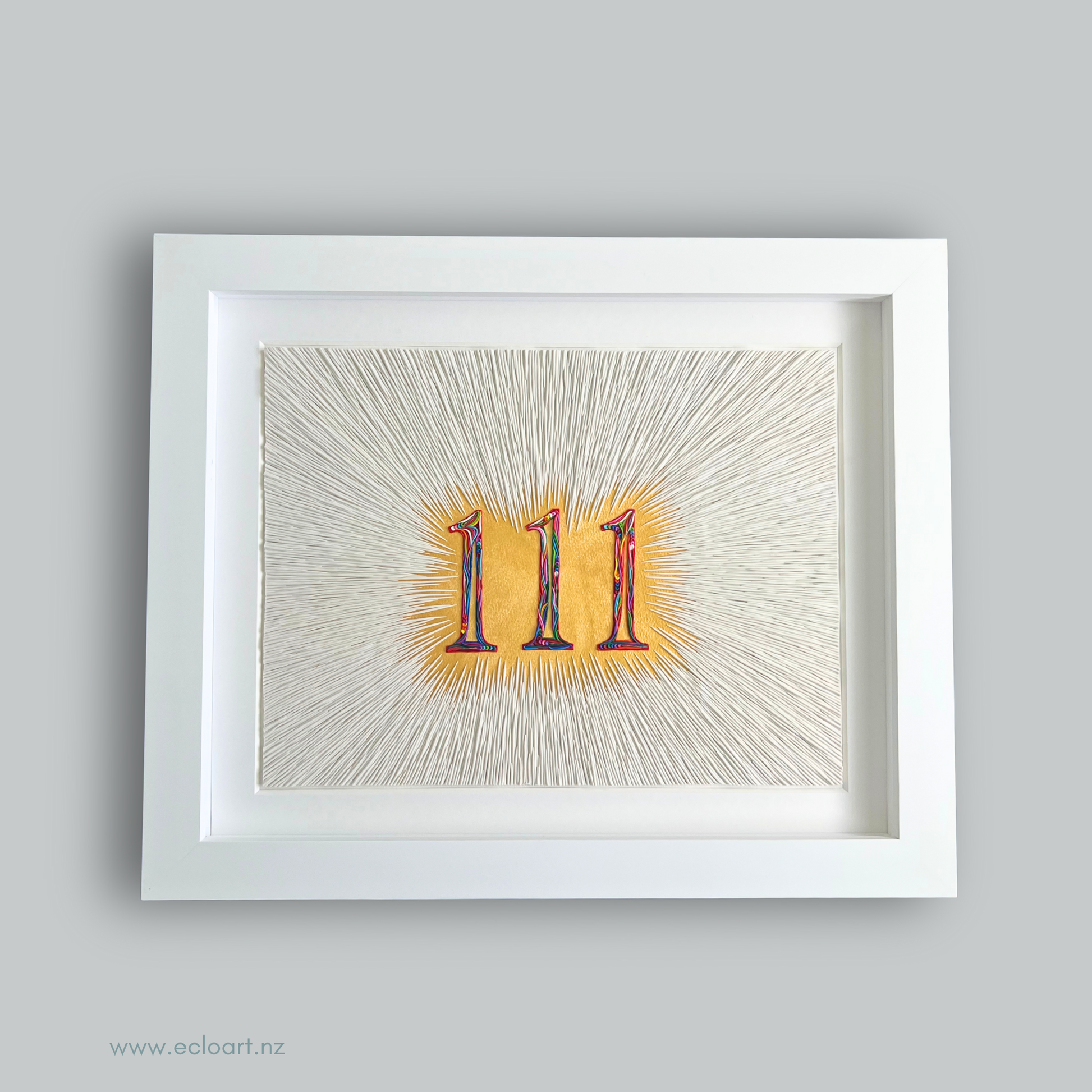 Golden acrylic beneath the surface creates a subtle glow, while fine white clay lines radiate inward toward the bold, colourful 111 at the centre. The composition mirrors the experience of recognising signs, synchronicities, and confirmations that gently remind us we are supported and guided.