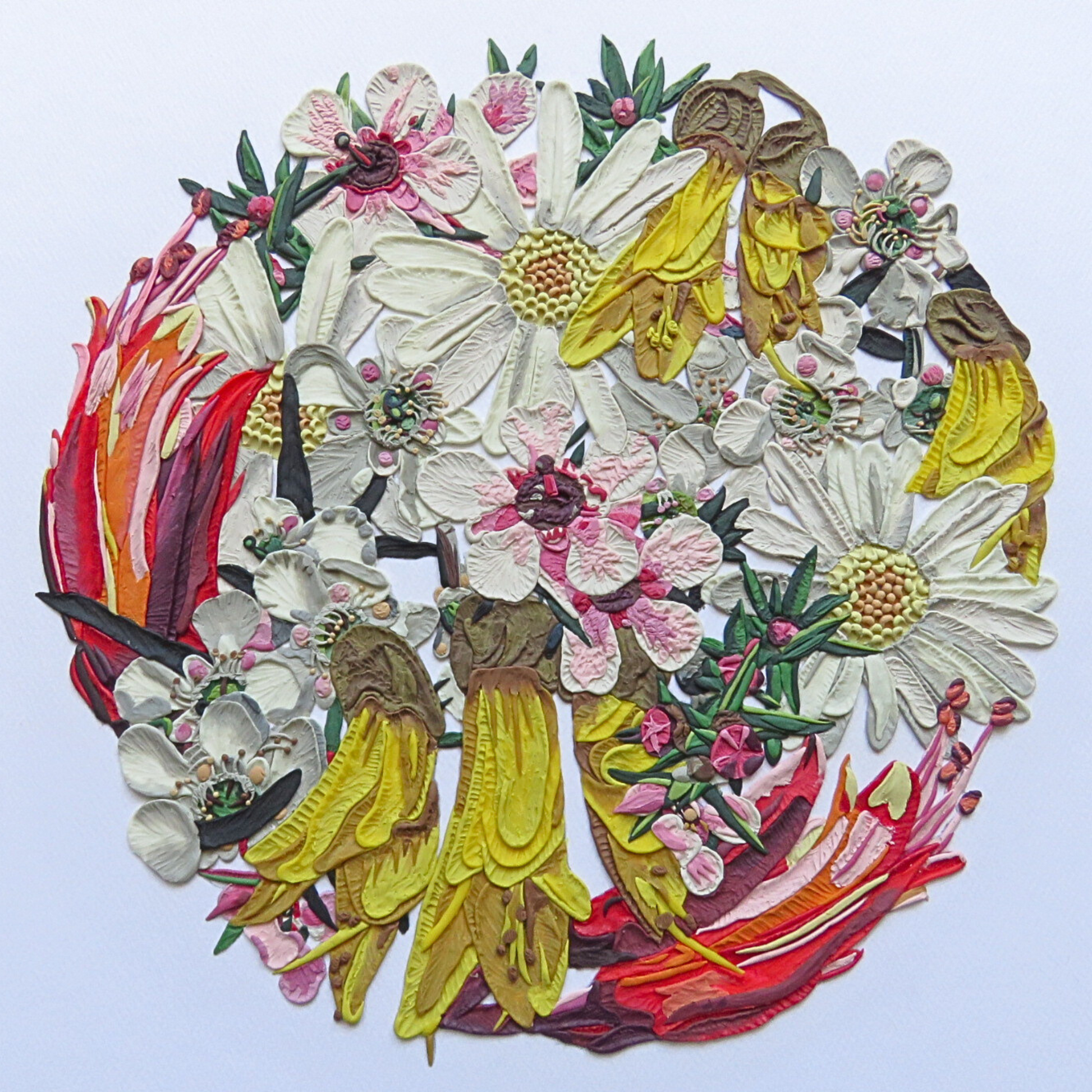 Capture the essence of nature with "My Floral Sunshine," a stunning clay artwork born from the collaboration between Clay Artist Emy Oikawa and NZ Contemporary Artist Anna Mollekin. This artwork seamlessly marries Anna Mollekin's digitally hand-drawn floral artwork with Emy Oikawa's expert clay artistry. "My Floral Sunshine" showcases New Zealand's native flowers, including Kowhai, Manuka, Harakeke, and also Daisies arranged in a circular composition. Elevate your living space with this truly exceptional collaborative artwork, a testament to the remarkable talents of Emy Oikawa and Anna Mollekin.